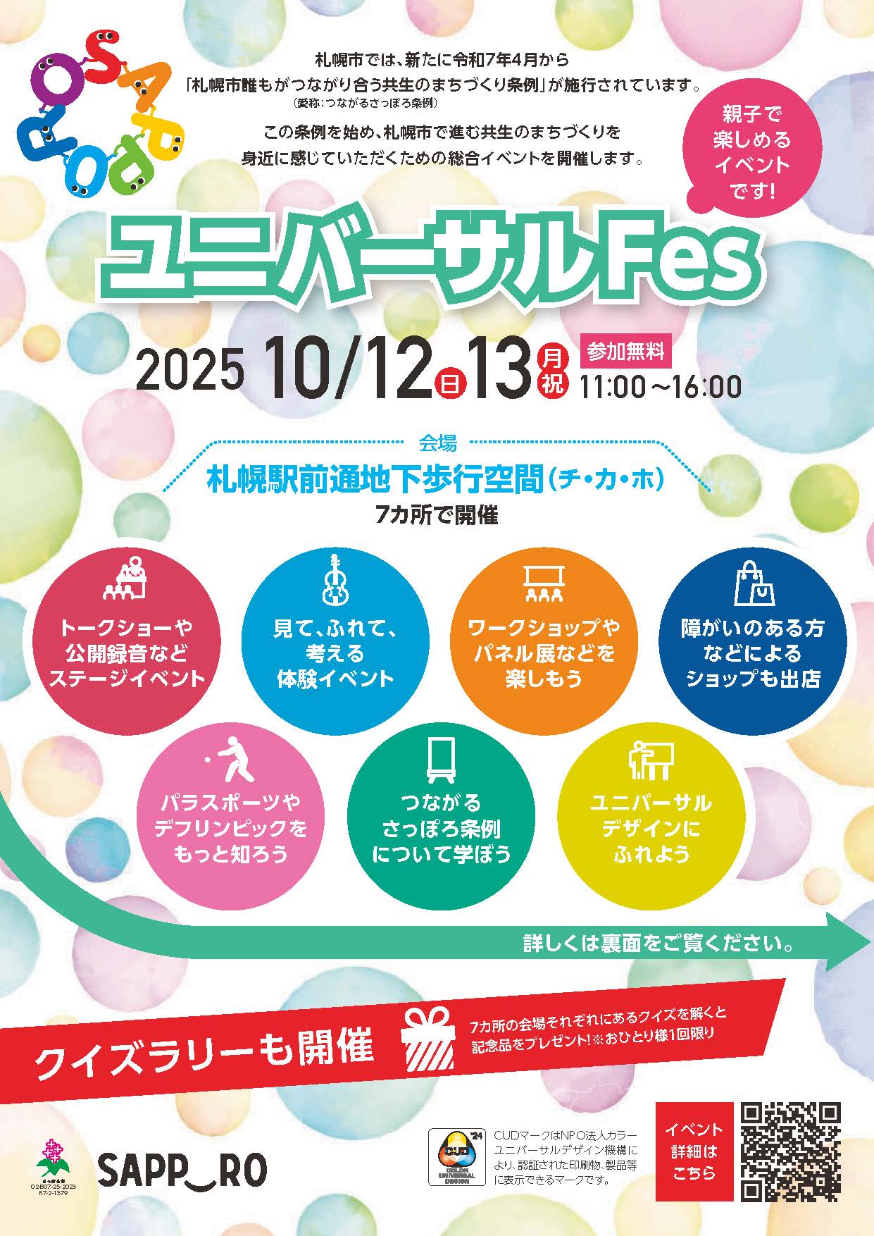 令和7年10月12日(日)・13日(月)に札幌駅前通地下歩行空間(チ・カ・ホ)にて開催されるユニバーサルFesにPAサポートセンターが出展します。 PA制度ではステージ発表やスキマ時間相談会の他、お子さんでも楽しめる「塗り絵」や「缶バッジ制作体験」「PA制度キャラクター総選挙」等のイベントも用意しています。 ぜひお気軽にお越しください。